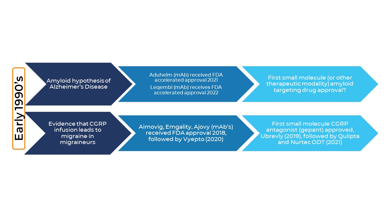 The timescale from the initial amyloid hypothesis of AD to the first therapeutic drug is not that dissimilar to the timescale for the first CGRP migraine therapies to hit the market after CGRPs role in migraine gained traction. Clearly, the challenges were different, but it shows you need to be in this for the long haul. Another similarity to the CGRP/migraine field that we hope to see in the AD field (!) is the arrival of oral small molecule treatments. Very soon after CGRP monoclonal antibodies were approved they were followed by small-molecule oral gepants.