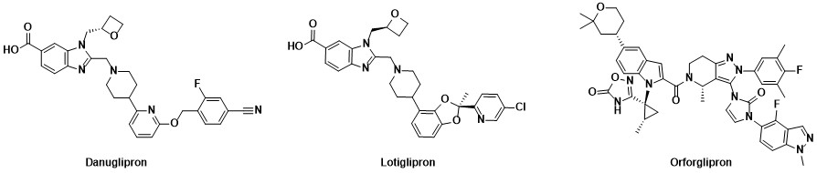 Orally dosed small molecule receptor agonists of GLP-1R such as danuglipron, lotiglipron and orforglipron (Figure 1) have been discovered and have progressed into clinical trials. These small molecules delivered substantial body weight loss (efficacy). For example, once-a-day orforglipron was associated with a 14.7% body weight loss after 36 weeks in overweight/obese patients. Danuglipron (dosed twice daily) and orforglipron (once daily) continue in clinical trials, while the clinical development of lotiglipron (once daily) was recently stopped due to elevated transaminase liver enzymes. Such elevations were not observed in the danuglipron program.