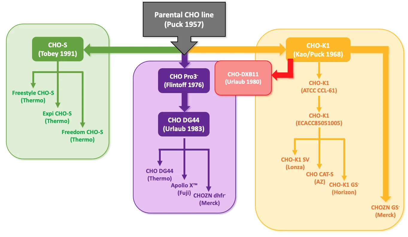More recently, advancements in gene editing technology have been used to generate suspension adapted CHO-K1 cells with single gene deletions. For example, Horizon Discovery working with Merck produced a GS-CHO-K1 knockout, creating CHO-K1 DHFR- and CHO-K1 GS-. A summary of all these CHO lineages is depicted in Figure 2.