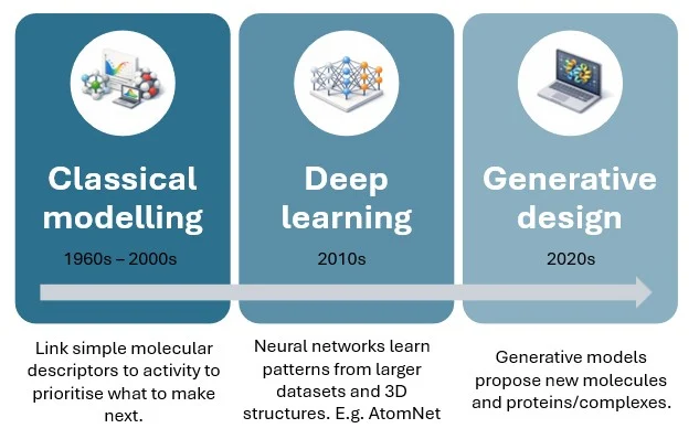 Figure 1 – A timeline of AI in drug discovery. From QSAR models that linked simple molecular descriptors to biological activity, through the rise of deep learning, to today’s generative design and complex structure prediction.