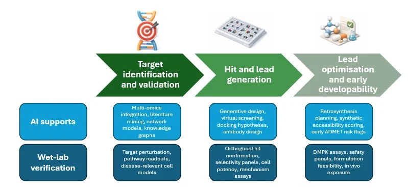 Figure 2 – Drug discovery stage map: AI supports target selection, hit and lead generation, and early developability triage, while wet-lab assays provide the evidence that confirms activity, mechanism, and risk. Linking the two into a single feedback loop turns predictions into decisions and improves the next modelling round.