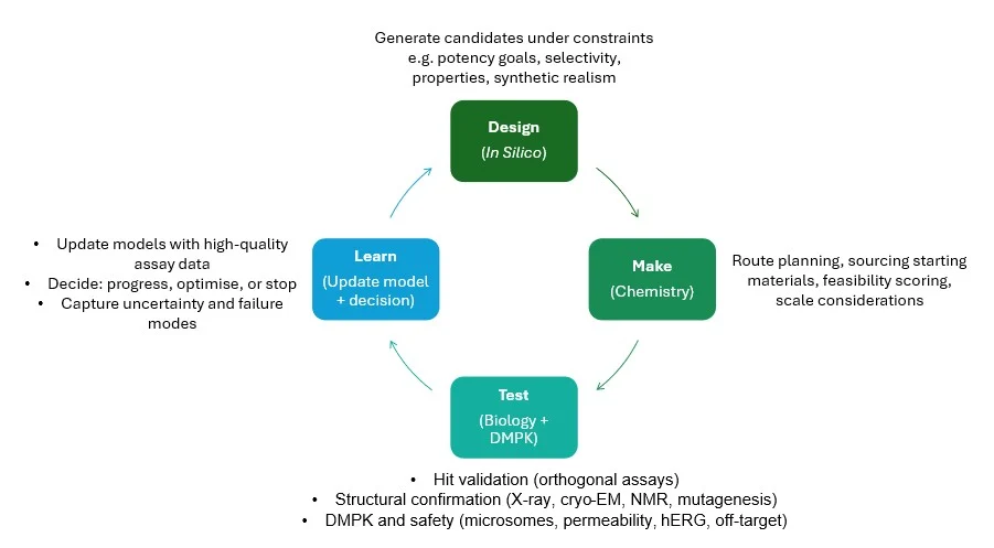 Figure 3 – Closed-loop discovery in practice: Design, Make, Test, Learn. Models propose and prioritise candidates, chemistry and biology generate real measurements, and structured results feed back into the next iteration. This loop is how AI increases speed and breadth without replacing the experimental checks needed to keep programmes grounded in biology.