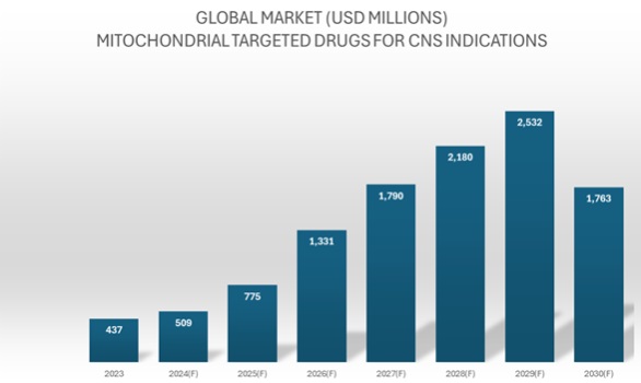 Figure 3: Mitochondrial-based therapeutic market size (in USD million) specifically for central nervous system (CNS) indications. Source: GlobalData /April 2024.
