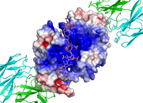 Figure 1a and 1b: The extracellular domain of G6b-B in complex with Fab fragment and DP12 heparin oligosaccharide (PDB:6R0X)