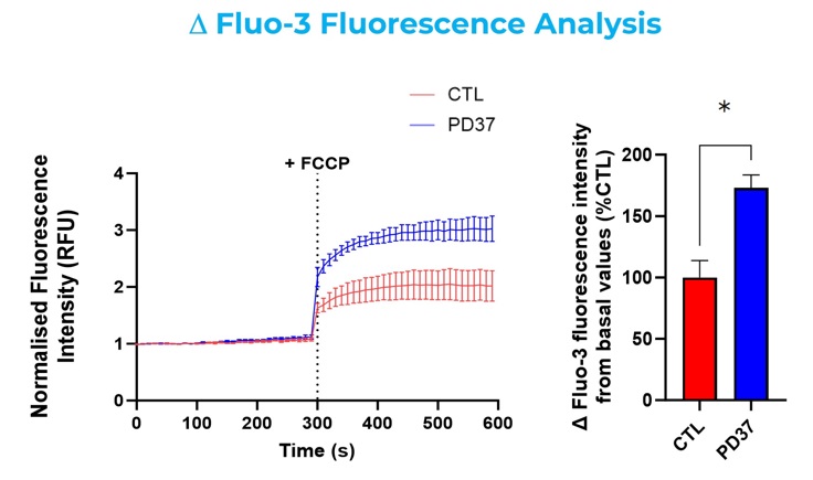 Figure 4: Representative line and bar graphics of control (healthy) and diseased fibroblasts incubated with Fluo-3-AM and TMRE. Kinetics readings in the absence and presence of FCCP. Data was expressed as a percentage of the control group. PD37: Parkinson`s Disease cell line.