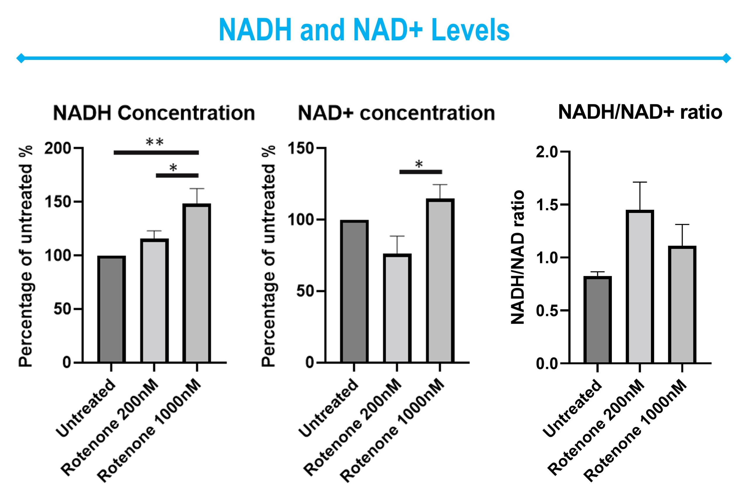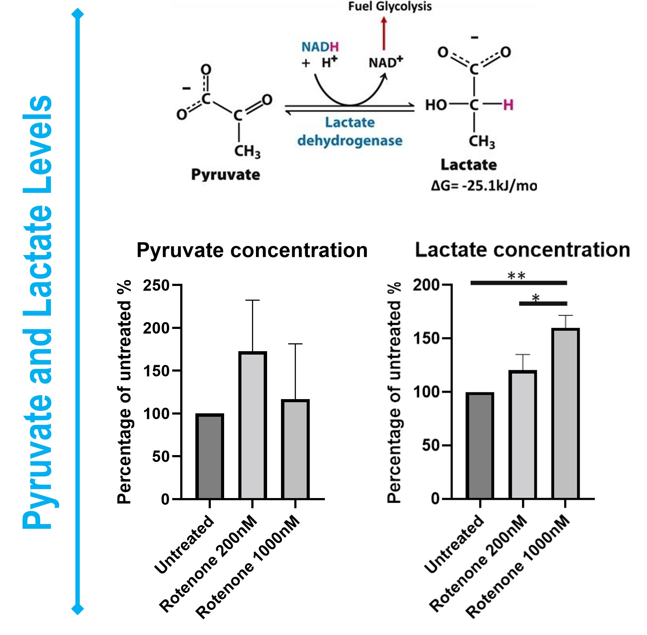 Figure 2: Representative bar graphics of ATP, ADP, NADH, NAD+, Pyruvate and Lactate levels on Rotenone-treated SHSY5Y cells. Data was normalized Data was expressed as a percentage of the control group.