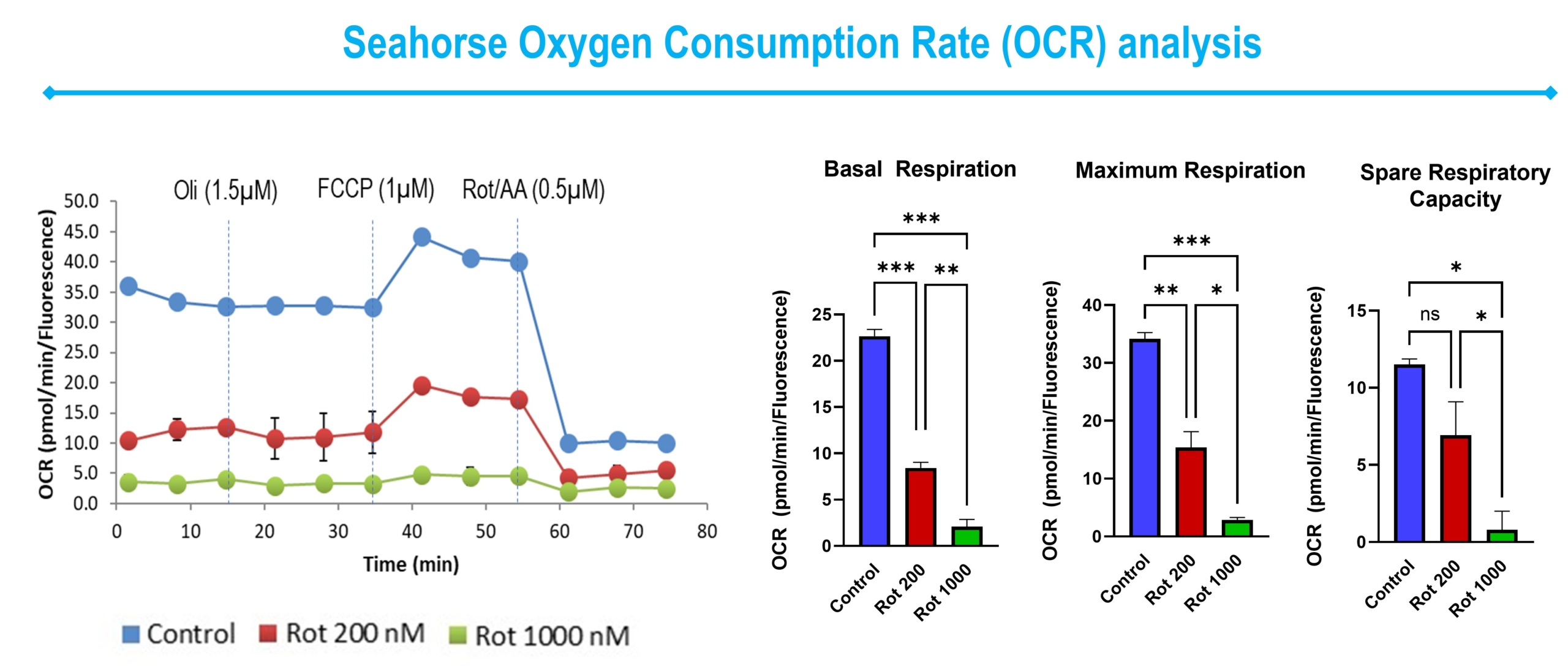 The Seahorse instrument measures Oxygen Consumption Rate (OCR). This platform allows the measurement of several mitochondrial respiration steps, namely basal respiration, maximum respiration and spare respiratory capacity (Figure 3).