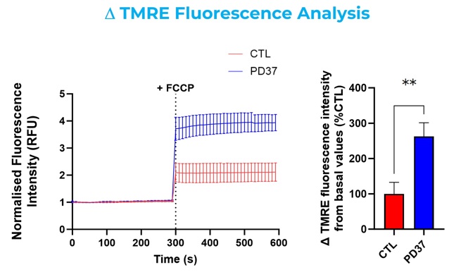 In mitochondrial research, kinetic experiments play a pivotal role in unveiling the complexities of mitochondrial function. These assays, characterized by their robustness, reproducibility, and validation, are instrumental in assessing the dynamical functional parameters of mitochondria. Employing fluorescence probes adaptable across diverse plate reader platforms, we can meticulously track changes in mitochondrial behaviour over time (Figure 4). This method enables the precise evaluation of mitochondrial functional status of healthy (control) and disease-affected cells (Figure 4).