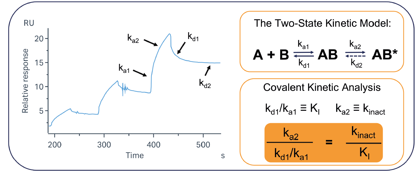 The overall potency of a covalent molecule is defined by two parameters: kinact (the rate of covalent bond formation) and KI (the strength of the non-covalent interaction. We can determine the values of these using the βtwo-stateβ fitting model, common to many SPR analysis platforms. This model aligns directly with the well-established parameters that have been determined for covalent binding. By using SPR to directly observe these constants, we can provide full characterisation in a relatively high-throughput format compared to other techniques. This technique is universally applicable to all target classes and does not rely on any inherent activity of the target in question.