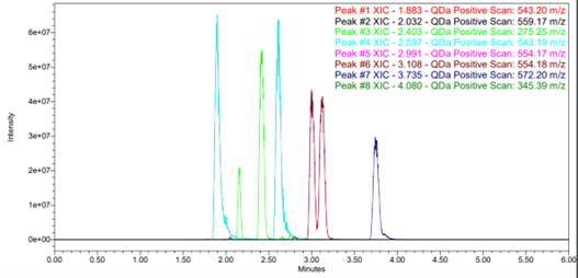One of the critical aspects of chiral screening is identifying the quickest route to the answer without needing multiple systems, which is especially true when receiving upwards of 50 racemates per month. Analysing in parallel is a key component of speed in chiral screening. ‘Chiral pooling’ is the terminology we use for injecting multiple analytes from a single vial and interpreting the SIR channels to identify suitable purification methods. As you can see from Fig 2, separation is observed for compounds with m/z 543 (light blue) and 275 (green), whereas an m/z 554 (brown) is partially resolved (RS<1.5) and m/z 572 shows no separation. m/z 345 does not elute from the column under these conditions. The other masses highlighted are minor achiral impurities.