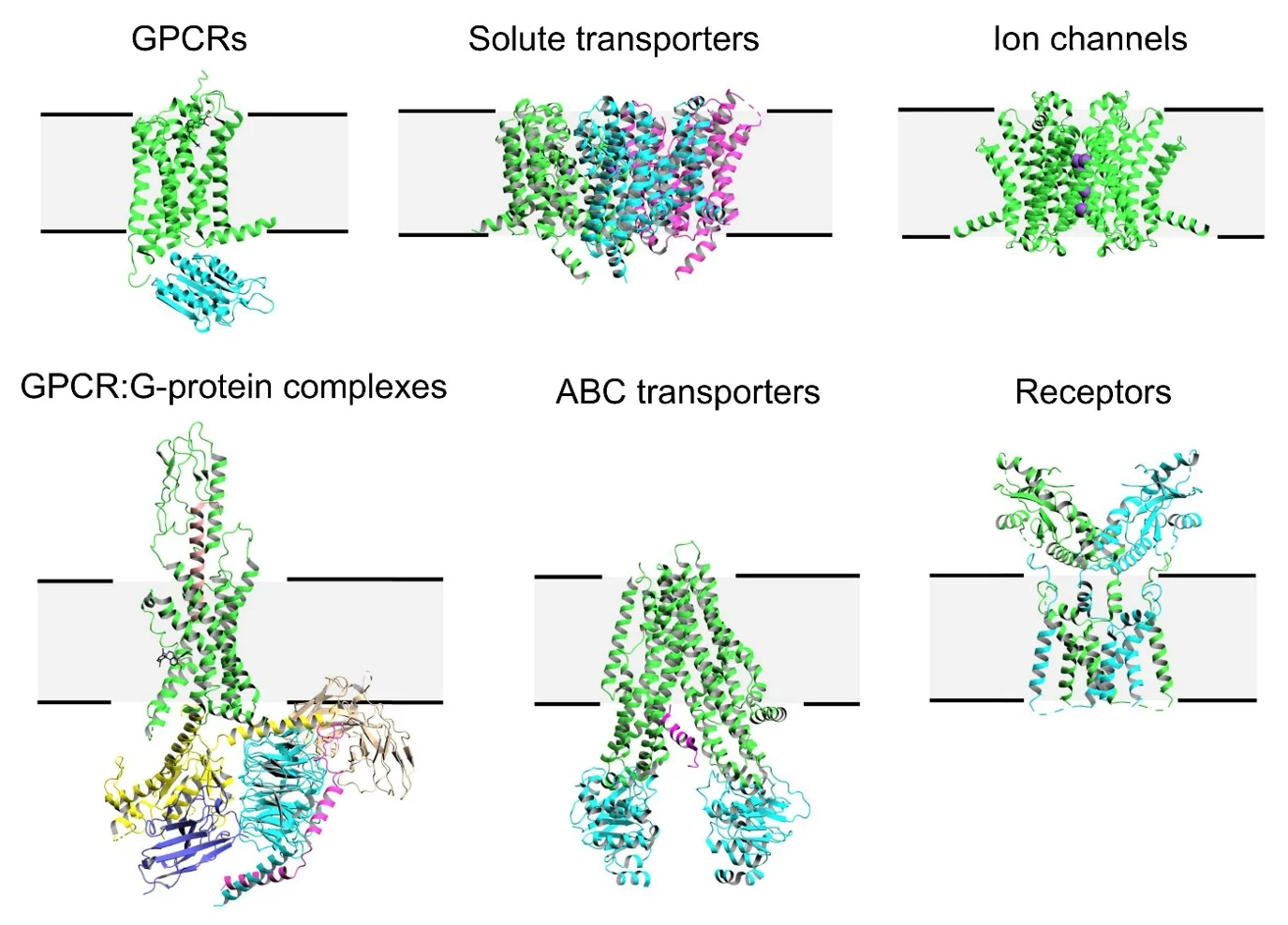 Multi-pass alpha-helical proteins – A snapshot of the membrane protein families that contain some of the most pharmacologically important targets, such as G protein-coupled receptors (GPCRs), ion channels, and transporters.