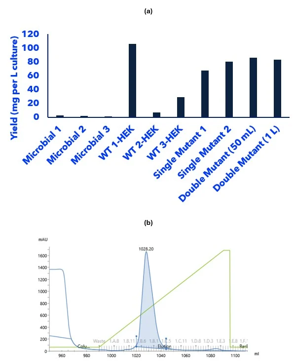 Figure 1. The desired expression and purification system was required to be high yielding and relatively inexpensive to produce. (a) Pivoting from microbial (E. coli) expression of the protein to mammalian expression significantly increased the yield of protein produced. (b) Secreted mammalian expression enabled a single ion-exchange chromatography column to be used to both capture and purify the protein to a high yield and purity.