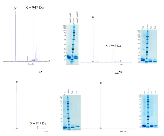 However, multiple O-glycosylated post translational modifications were observed by intact MS (Figure 2a). In order to help with a smoother regulatory approval, we recommended to the client that these were removed, aiming to produce a consistent single species as observed by MS. Based on our previous experience with a similar protein we suspected that certain Thr residues were being glycosylated. We therefore systematically mutated these Thr residues to Ala (Figure 2b-c) and were rewarded with success. A double mutant variant of the protein removed all O-glycan modification and produced a single species (Figure 2d).