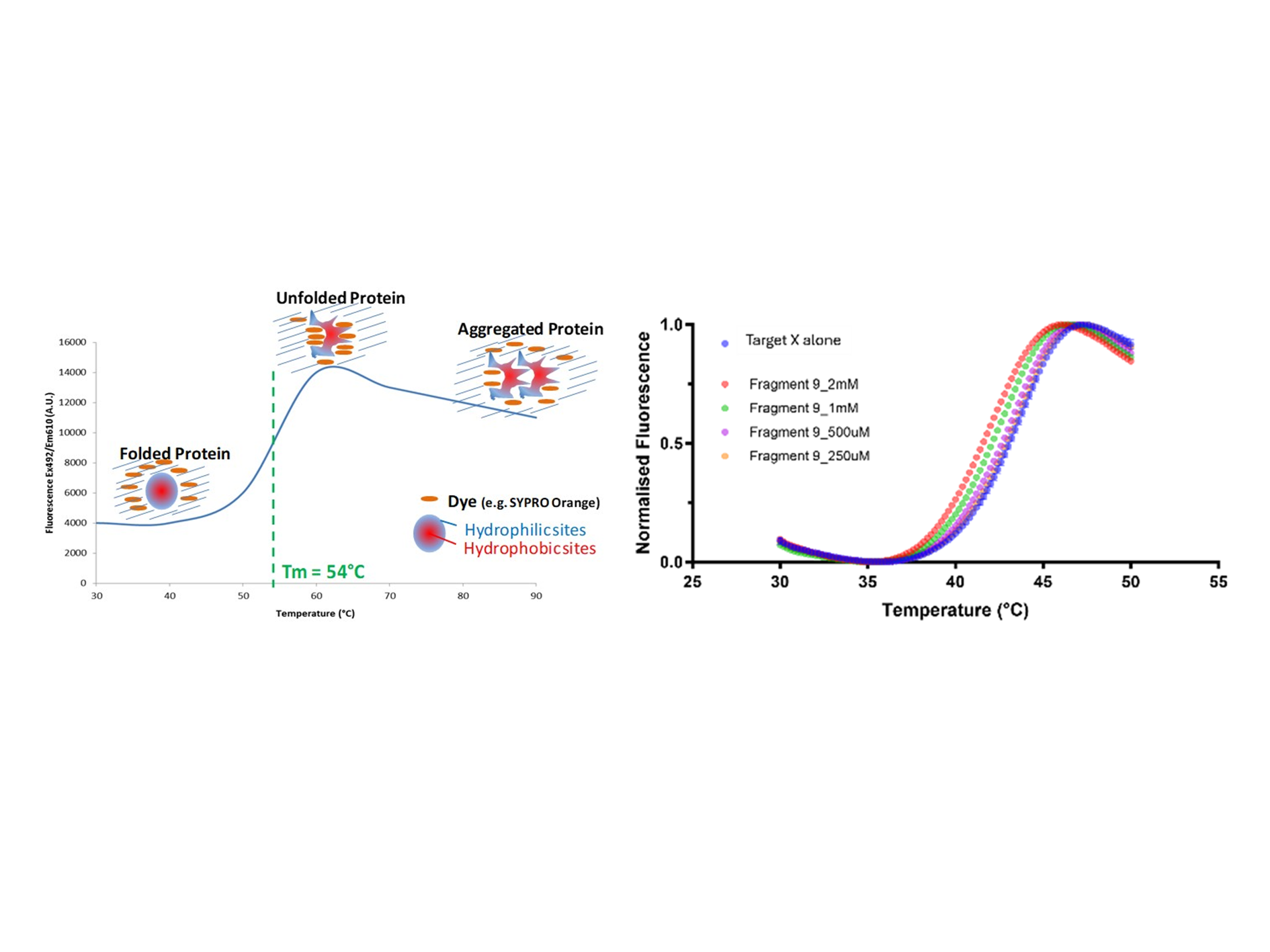Figure 1: Illustration of the fluorescent responses observed as a protein unfolds in a differential scanning fluorimetry experiment (L), data from a DSF experiment for target alone in the presence of varying concentrations of a hit fragment, illustrating the effect on the target melting temperature, Tm (R).