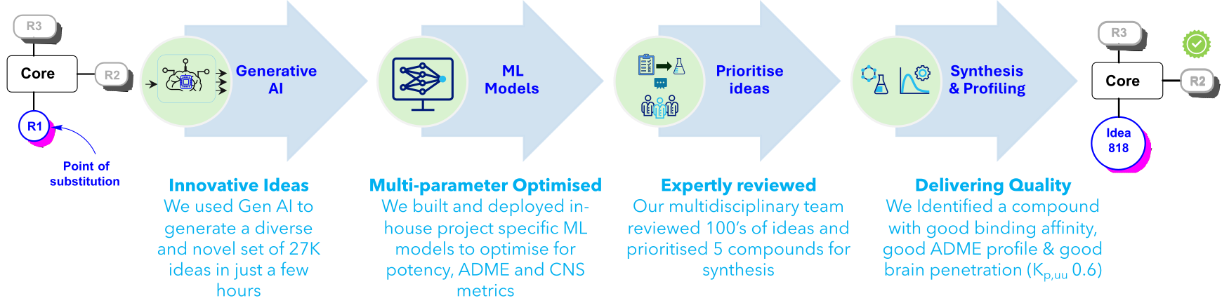 A client project focused on a CNS indication required a multi-parameter optimization (MPO) strategy to enhance CNS penetration. To support this, Generative AI was used to propose modifications at the R1 position, resulting in a remarkably diverse and novel set of 27,000 ideas, generated within just a few hours. These ideas were evaluated using a custom, project-specific KNIME-Hub SaaS workflow that modelled ADME properties across multiple parameters, to enable efficient triage. Hundreds of candidates were reviewed collaboratively by the Computational Chemistry and Medicinal Chemistry teams. This multidisciplinary effort led to the prioritization of 5 compounds for synthesis. Of these, Compound Idea 818 demonstrated the desired profile; strong binding affinity, favourable ADME characteristics, and good brain penetration (Kp,uu0.6).