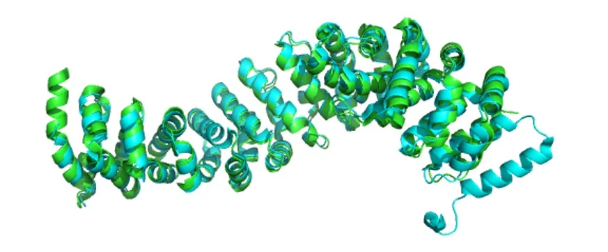 Figure 1. Overlay of truncated mutant CTNNB1 (PDB: 2GL7, green) and truncated CTNNB1 (PDB: 2Z6H, cyan) shown in cartoon format.