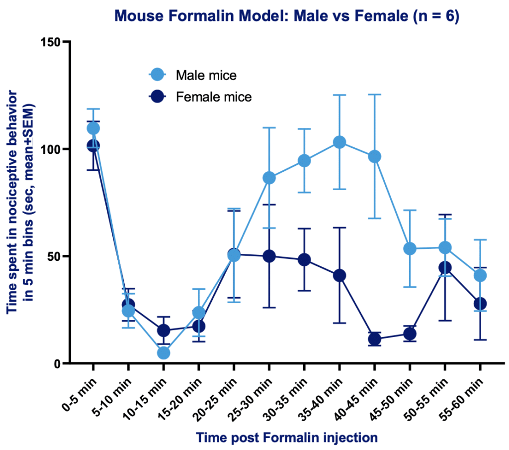 In the comprehensive evaluation of the mouse-formalin pain model, a salient observation is the pronounced pain response exhibited by male mice compared with the females, a factor that underpins our choice to utilize males for the model. Their heightened sensitivity offers a more robust platform to discern and quantify pain reactions, making the analysis more nuanced and informative.