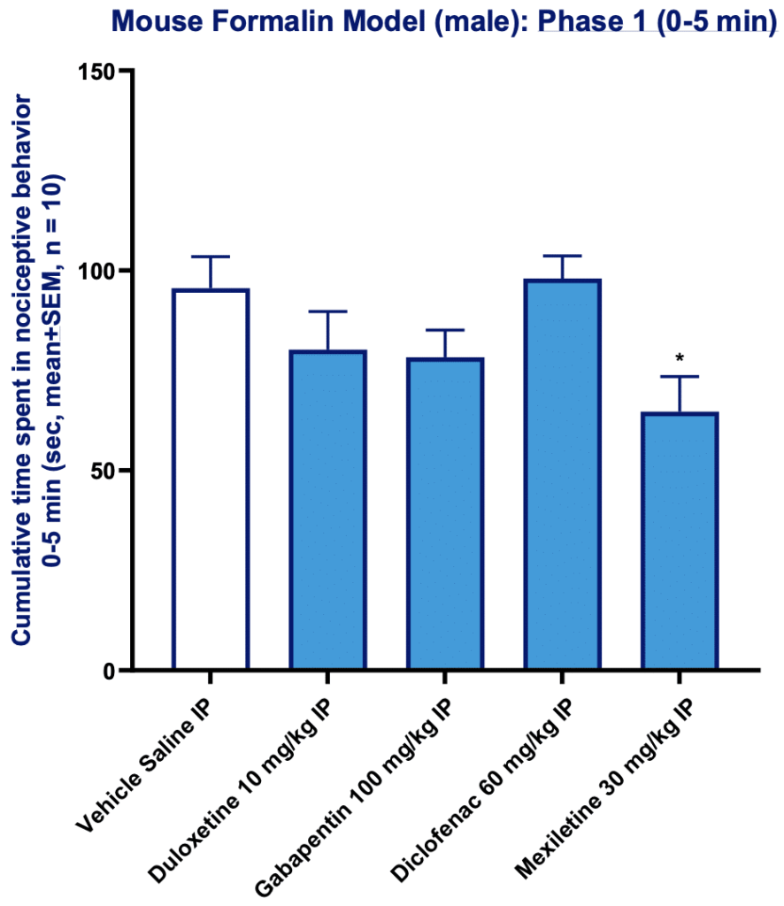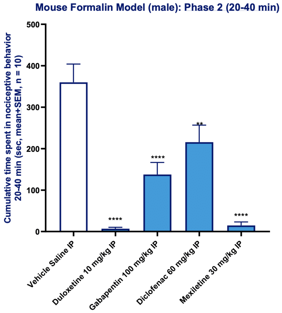 The four clinically used prototype analgesic drugs were then tested in male mice in this model. For rapid screening purpose, 0-5 minutes and 20-40 minutes are often taken as representation of Phase 1 and Phase 2, respectively, of this model. In the Phase 1 of formalin pain model, except for Mexiletine producing a very minor analgesic effect, none of the other analgesic drugs could produce any analgesia. In the Phase 2 of formalin pain model, all four analgesic drugs produced significant and strong analgesic effects indicating higher back-transitional face value of the Phase 2 of formalin pain model. The order of analgesia of the four analgesic drugs was as follows: duloxetine Λ mexiletine Λ gabapentin Λ diclofenac, which is also consistent with their clinical efficacy often seen in chronic pain. In this regard, itβs crucial to accentuate the predictive prowess of Phase 2 within the model. This phase, replicating certain facets of neuropathic pain, proves especially potent in forecasting the potential of analgesic targets. The pronounced responsiveness in Phase 2 serves as an invaluable predictor, often aligning closely with the efficacy and mode of action of analgesic compounds. In essence, the male mouse as the chosen specimen, coupled with the distinct utility of Phase 2, augments the mouse-formalin pain modelβs credibility and value in our quest to decipher and modulate pain pathways.