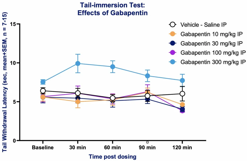 A suite of four drugs – Duloxetine, Mexiletine, Diclofenac, and Gabapentin – were tested within this framework. As expected, none of these drugs could produce any meaningful analgesic effects in this model which is more sensitive to centrally acting opioid drugs, as discussed earlier. Of the cohort, Gabapentin demonstrated notable effects, but only at a dosage of 300 mg/kg. It’s pivotal to underscore, however, that alongside these effects, there were concomitant adverse reactions observed at this dose level of Gabapentin. The findings, particularly the nuanced response with Gabapentin, emphasize the critical balance between therapeutic potential and safety considerations in drug evaluations.