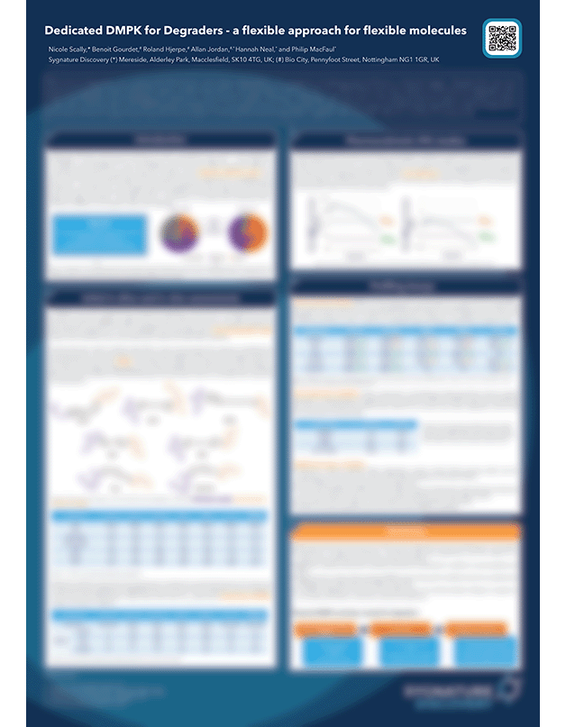 Bifunctional degraders bind and degrade proteins via ubiquitin ligase, despite breaking bRo5 rules. Translating in vitro DMPK data to in vivo performance remains a challenge. At Sygnature Discovery, we provide tailored assays and expertise to support projects involving these compounds. Read more in the poster.