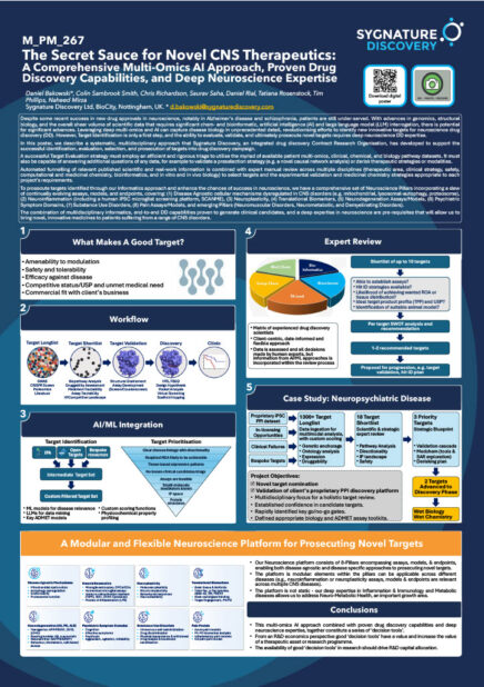 As CNS drug discovery grows more complex, so does the need for smarter, more integrated approaches to target identification and validation. In this poster, Sygnature Discovery outlines a comprehensive platform combining multi-omics data, AI-powered analysis, and deep neuroscience expertise to accelerate discovery for neurodegenerative and neuroinflammatory disorders. By combining proven drug discovery capabilities, a modular neuroscience platform, and deep therapeutic expertise, we accelerate the path from data to clinical candidates—tailored to client goals and underpinned by expert-driven decision-making.