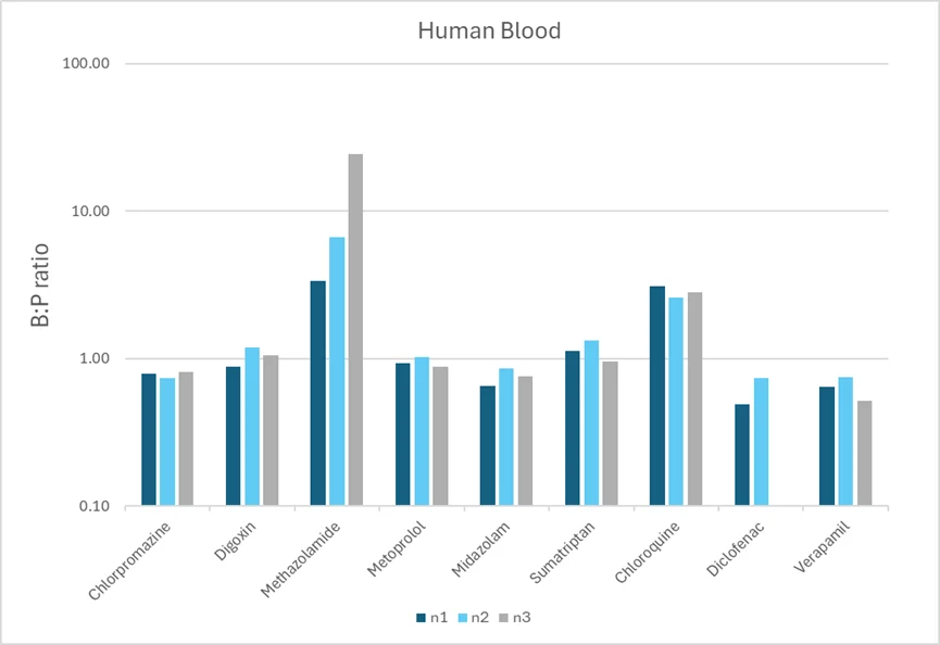 Compounds known to have a preference for the cellular component of blood e.g. Methazolamide and Chloroquine returned B:P values >1. Compounds known to have a preference for blood plasma e.g. Diclofenac returned B:P values <1 and compounds such as Digoxin and Metoprolol known to distribute evenly between both components returned B:P values ~1.