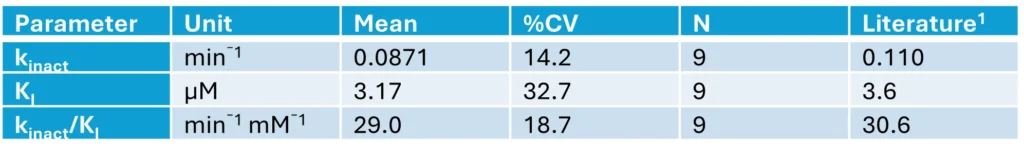 Validation of the CYP3A4 (Midazolam) kinact/KI assay demonstrated robust performance, strong reproducibility, and alignment with established literature values. Mifepristone was used as the positive control to benchmark the system, generating nine independent determinations across the validation exercise. The resulting kinact, KI and kinact/KI metrics showed high consistency and fell within expected ranges, demonstrating the suitability of the assay for reliable assessment of time-dependent inhibition. The mean kinact value obtained for Mifepristone was 0.0871 min⁻¹ in line with expectations. KI was similarly aligned, with a measured mean of 3.17 µM. The resulting kinact/KI ratio was 29.0 min⁻¹ mM⁻¹, again comparable to literature. Coefficients of variation across nine assays were low for kinact (14.2%), KI (32.7%) and kinact/KI (18.7%), demonstrating tight clustering and analytical reproducibility. Together these metrics confirm that the assay reliably quantifies CYP3A4 enzyme inactivation kinetics and is suitable for screening compounds. The strong concordance with literature further supports the scientific validity of the methodology.