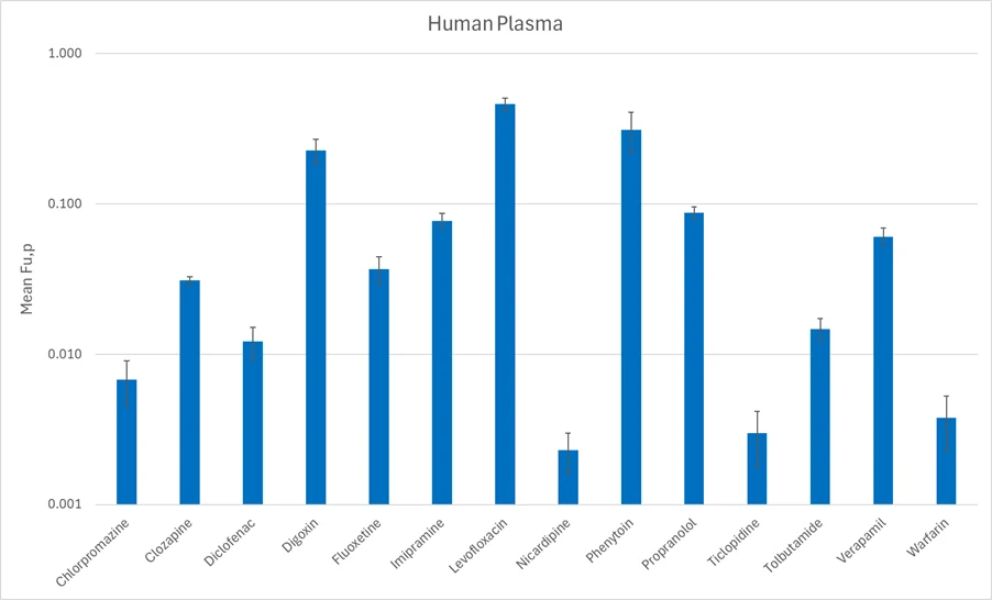 Validation studies assessed binding across five species (Human, Rat, Mouse, Dog and Monkey) using panels of structurally diverse compounds, spanning a wide range of acid/base classes, molecular weights and lipophilicities. Compounds included Levofloxacin, Propranolol, Nicardipine, Oxaprozin and Itraconazole, representing a spectrum of binding capabilities from moderate to highly bound (>99%).