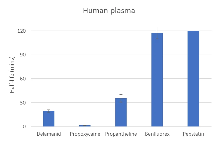 By incorporating multiple species and a diverse compound set spanning rapidly degraded compounds such as Propoxycaine to highly stable molecules such as Pepstatin, the assay demonstrates suitability for characterising a broad range of behaviours. Overall, the dataset confirms that the plasma stability platform is an essential early‑stage ADME tool for identifying potential liabilities and guiding medicinal chemistry optimisation.