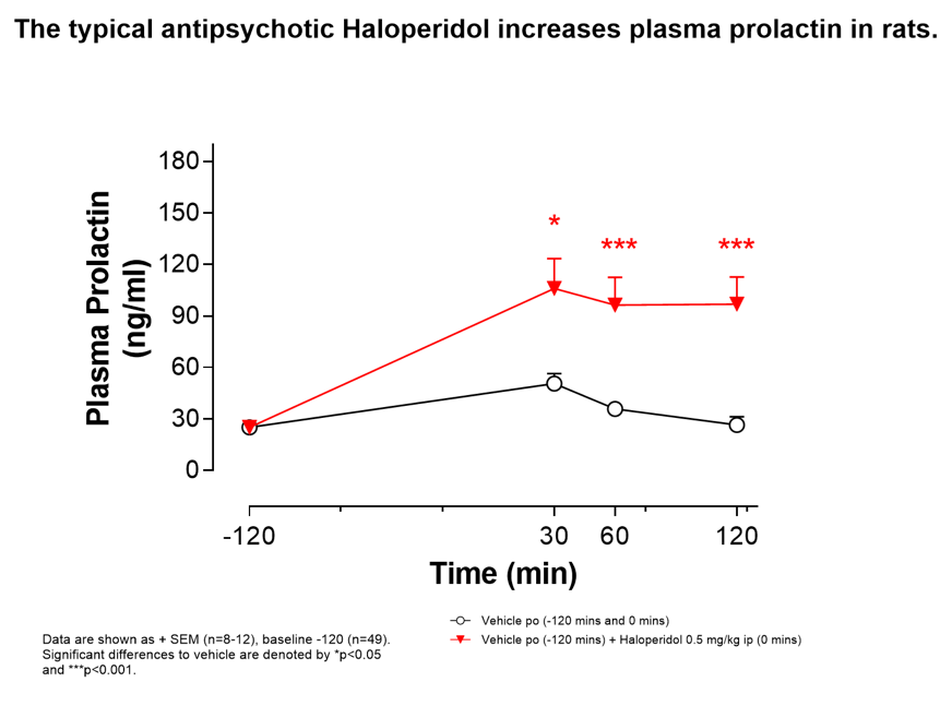 Increased plasma prolactin can be  a side-effect of antipsychotic drug administration, typically associated with Dopamine D2 receptor antagonism. We offer a plasma prolactin assay that can assess whether novel drugs to treat schizophrenia increase circulating levels of this pituitary hormone.